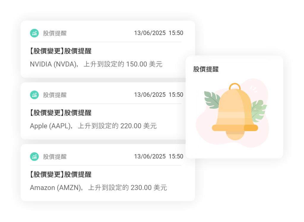 易高特設美股報價提醒功能,用戶可自訂股票、價位等條件,當觸及設定指標時即時收到推送通知。無論你身處何地,關注的投資標的一有異動,第一時間掌握訊息,助你快速反應,抓住每一個交易良機,提升投資成功率。